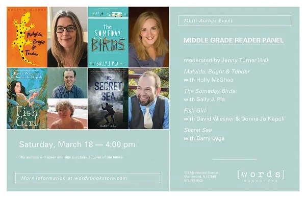 I’m also doing two events very soon that I wanted to let you know about. The first is a middle-grade panel at [words] maplewood bookstore on Saturday, March 18, at 4 p.m. I’m excited to be on this panel with other middle-grade authors Sally Pla, Barry Lyga, and David Weisner, and I’m especially happy that my very funny, smart & sassy friend and fellow writer Jenny Turner Hall will be the moderator. It’s sure to be a thoughtful discussion, with a lot of laughs I promise! If you’re in the New York / New Jersey area, I hope you can come.